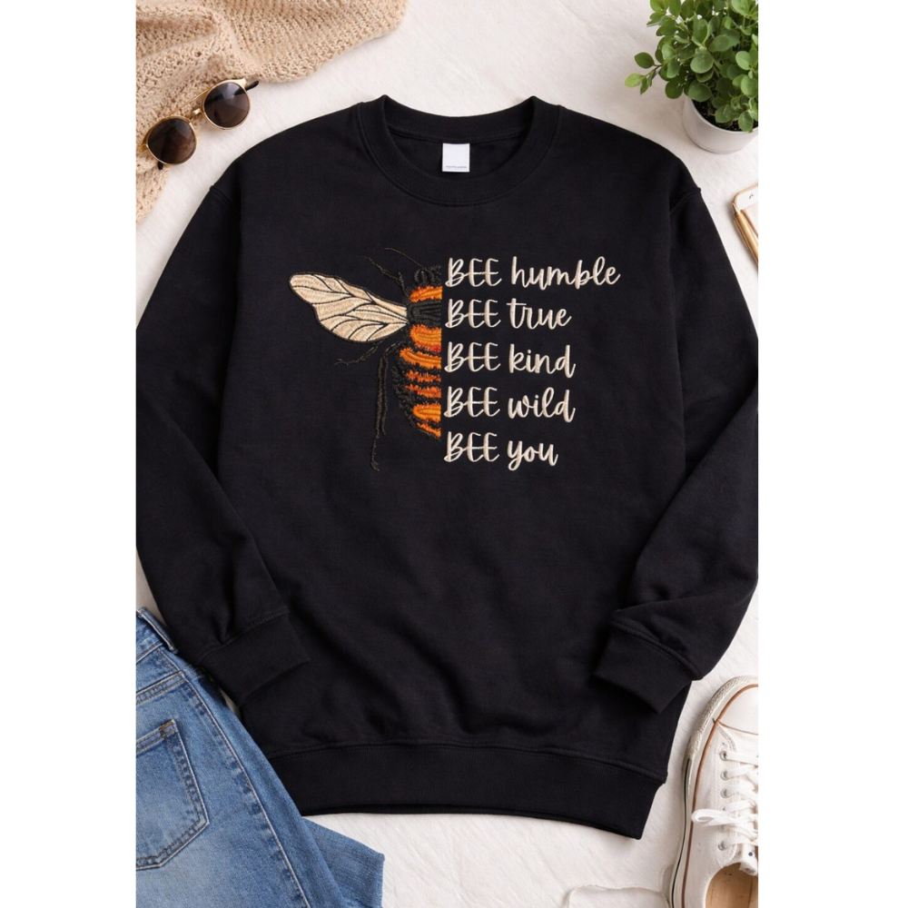 A charming motivational bee embroidery design featuring the quote “Bee Humble, Bee True, Bee Kind”, crafted for clean, high-quality machine embroidery on apparel.