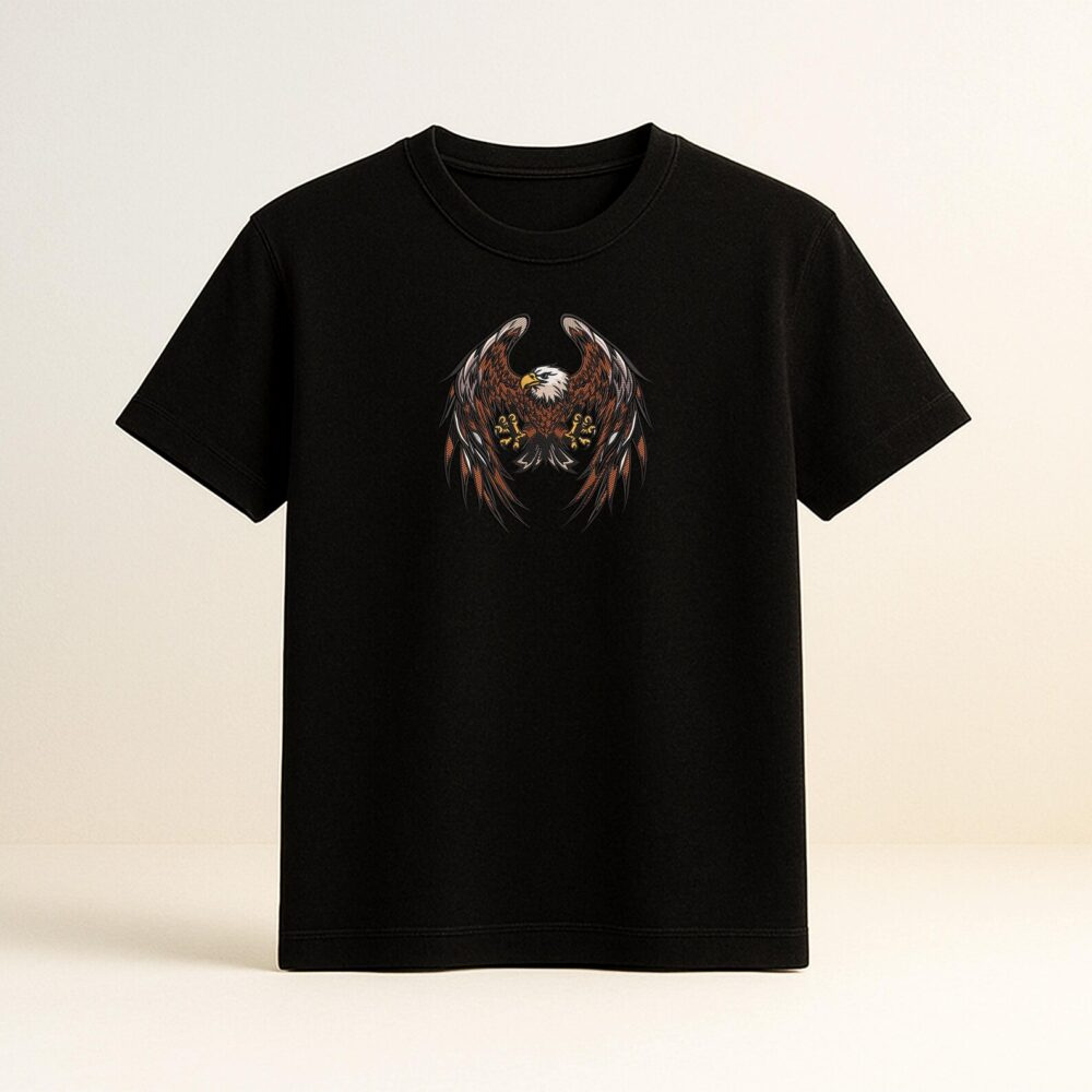 A detailed eagle embroidery crafted with precision stitching, representing power and independence. Ideal for T-shirts, hoodies, and custom garments.